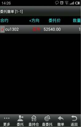 查委托:點擊“查委托”,進入委托單界面,可以查看到委托的合約、委托價格以及數