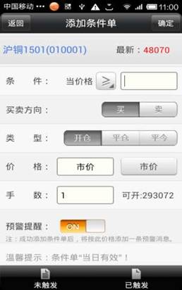 有效時間:條件單的有效期只有“當日有效”,即設置的條件單,只當天交易日有效,