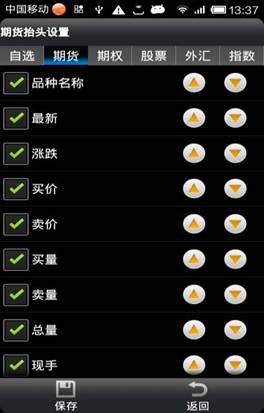 ◇ 設(shè)置自選、期貨、期權(quán)、股票、外匯、指數(shù)等六大市場顯示的抬頭字段及字段的順序。