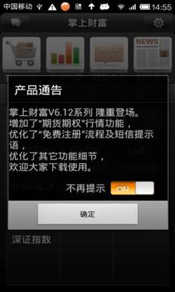 ◇ 消息中心提醒:設(shè)置掌上財富軟件登錄時是否允許彈出消息中心對話框,默認(rèn)為“開啟”。