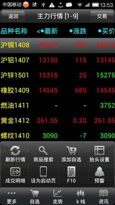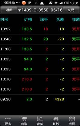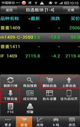 品信息,點擊“更多”可以商品搜索,刪除自選、上、下移自選,成交明細(xì),抬頭設(shè)置,