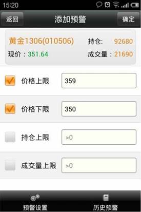 ◇ 可以對價格上限,價格下限,持倉上線,成交量上限做預(yù)警設(shè)置,價格上限和價格下限